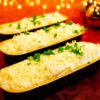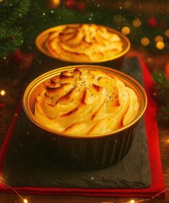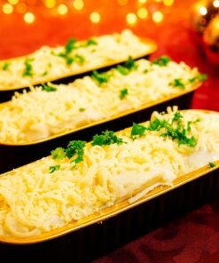 Een rechthoekig 1 persoons taartje van aardappelschijfjes, room, laurier, sjalotjes en oude kaas.