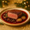 Getrancheerde hertenbiefstuk in een cognac pepersaus van jus de veau.